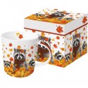 Duży kubek wykonany z porcelany new bone china o średniej grubości ściankach, z fantastycznym wzorem szopów bawiących się w kolorowych liściach.