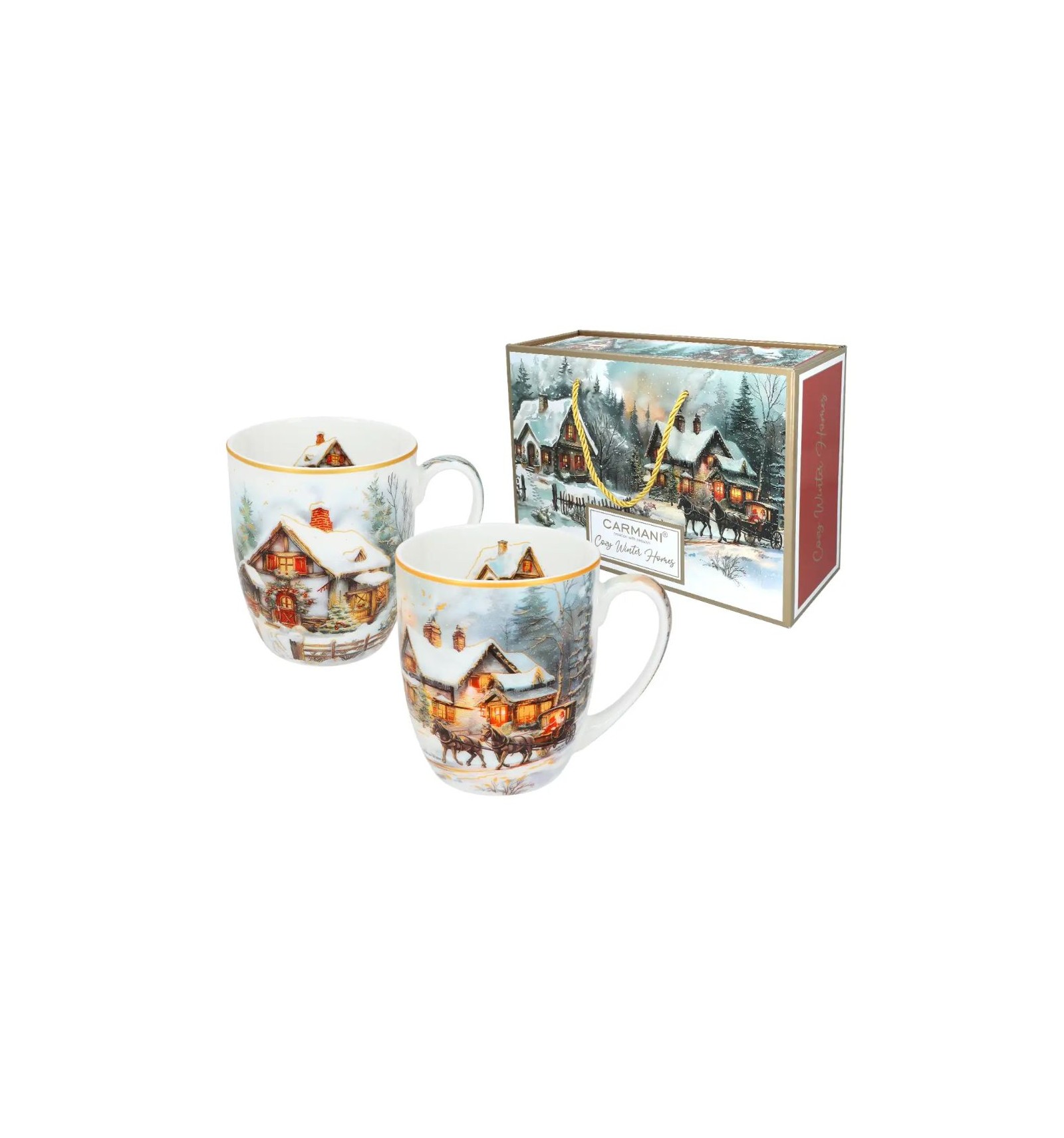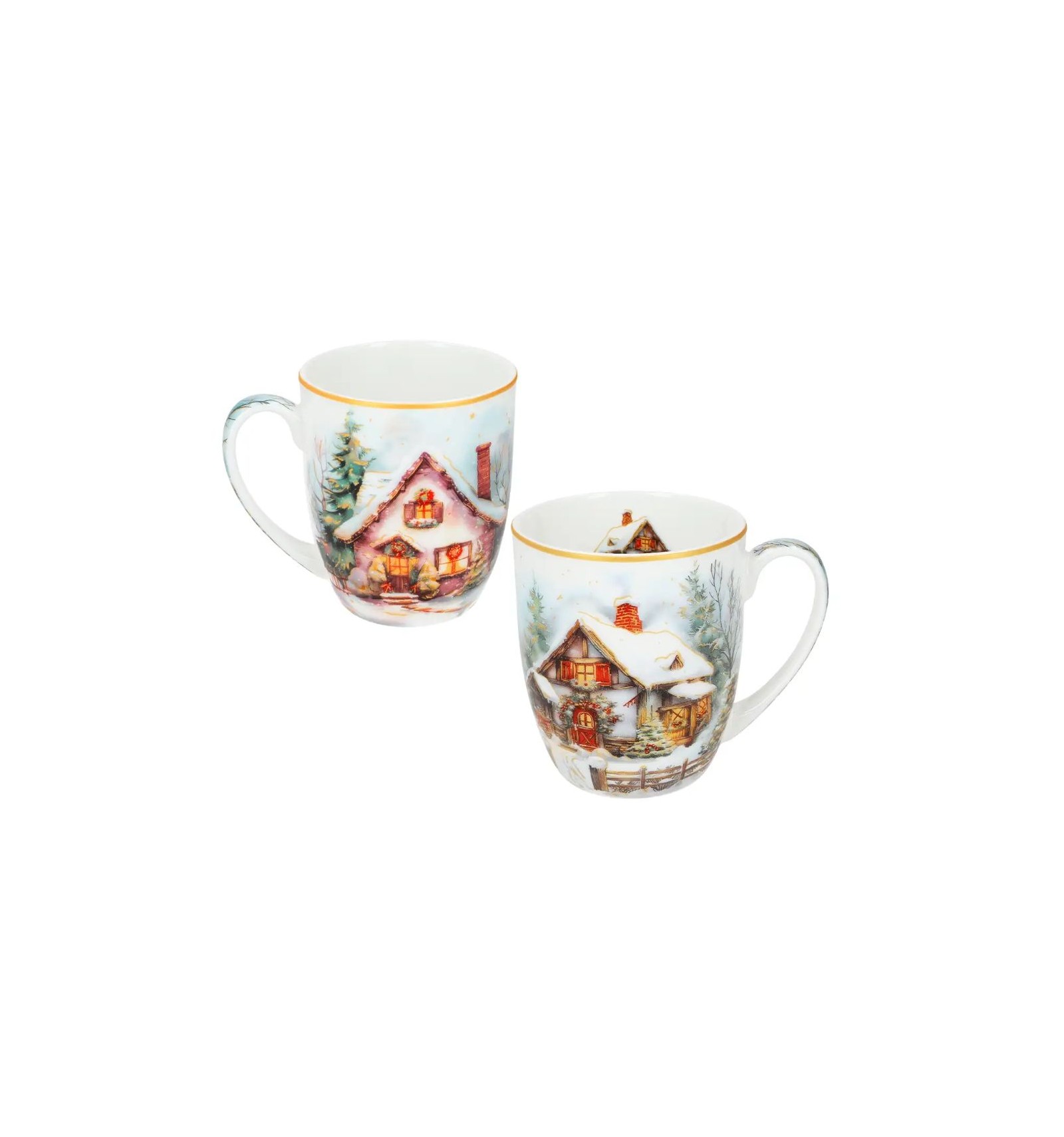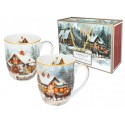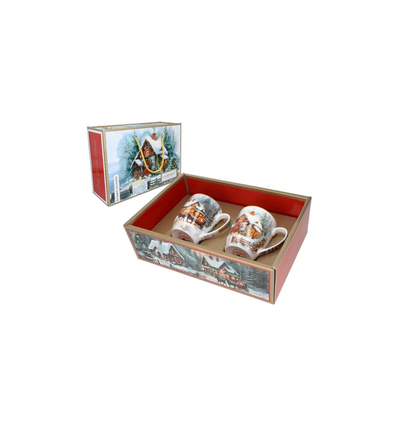 2 kubki wykonane z porcelany bone china, przedstawiające urokliwą, zimową scenerię, podkreślającą świąteczny klimat.