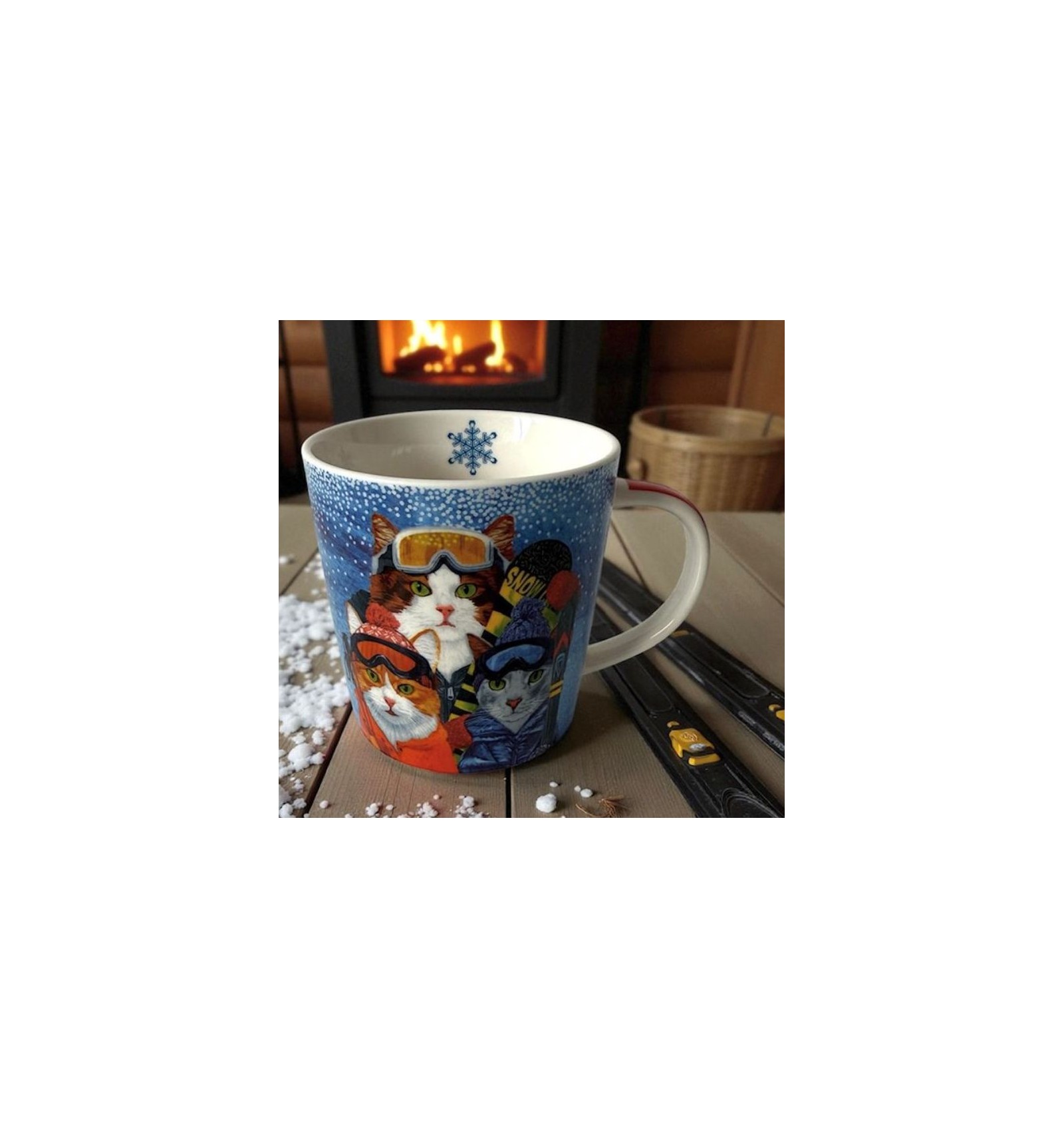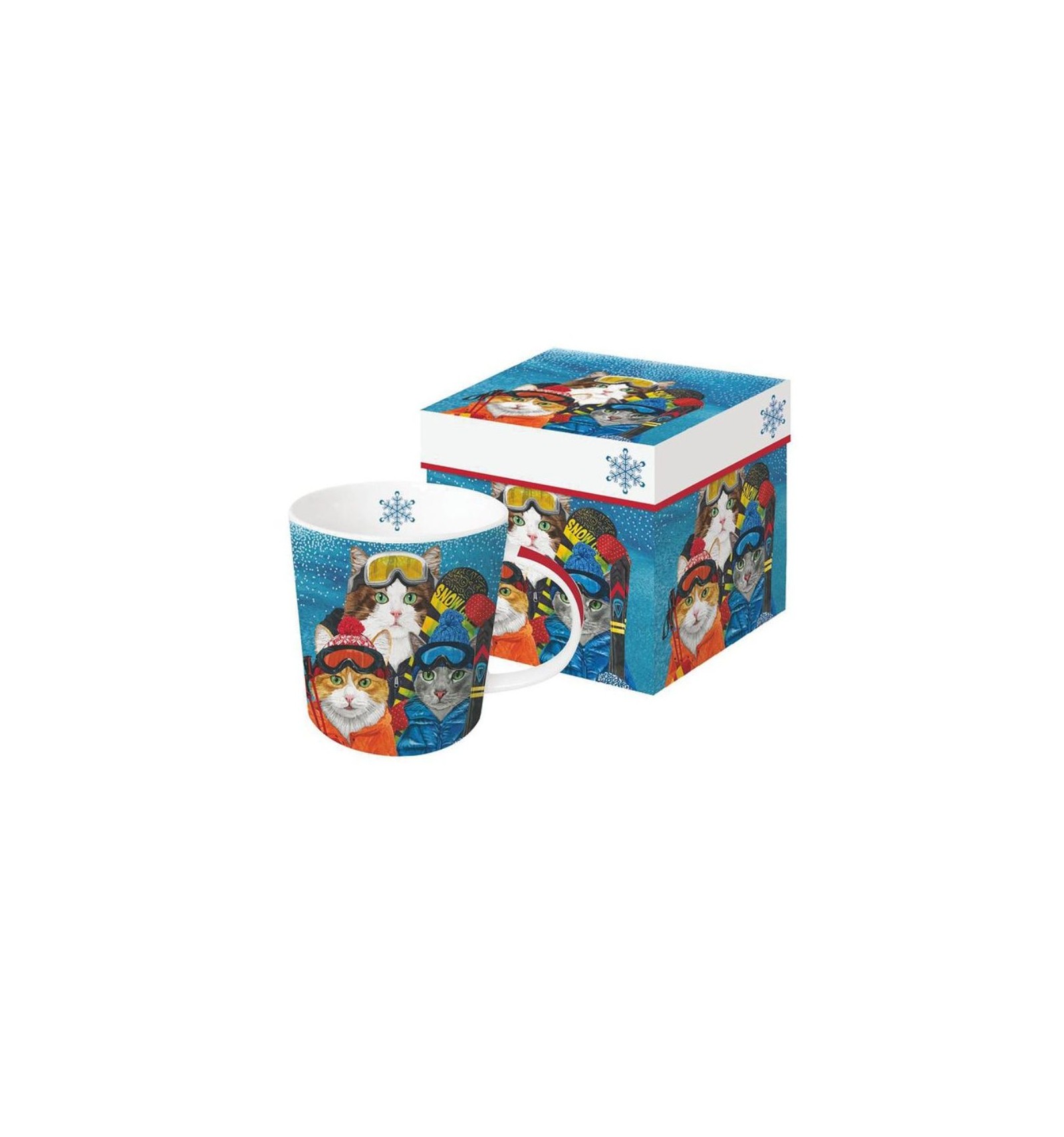 Duży kubek wykonany z porcelany new bone china o średniej grubości ściankach, z fantastycznym wzorem kotów narciarzy.