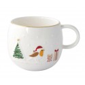 Porcelanowy kubek w kształcie beczułki, z eleganckim, wypukłym zdobieniem. Kubek wykonany jest z porcelany bone china, w odcieniu kości słoniowej, z delikatnym złotym otokiem. Posiad wygodne uszko, zapakowane jest w ładne pudełko, ze wzorem z kubka.