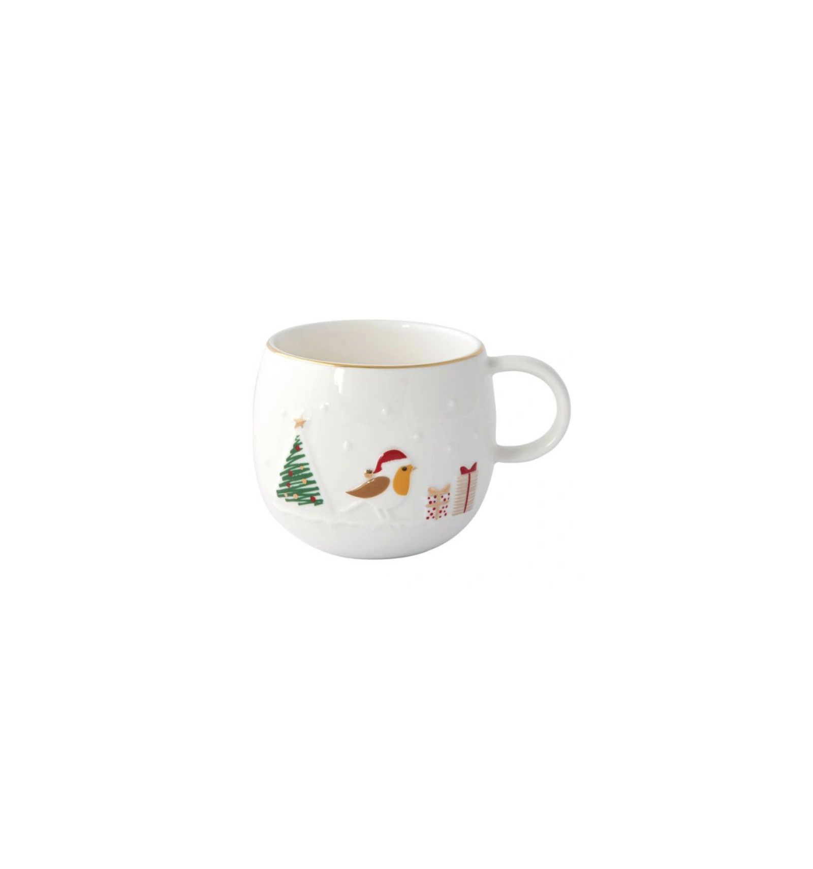 Porcelanowy kubek w kształcie beczułki, z eleganckim, wypukłym zdobieniem. Kubek wykonany jest z porcelany bone china, w odcieniu kości słoniowej, z delikatnym złotym otokiem. Posiada wygodne uszko, zapakowane jest w ładne pudełko, ze wzorem z kubka.
