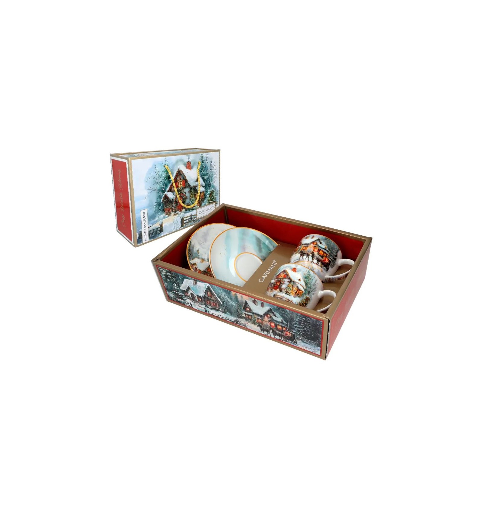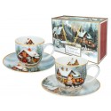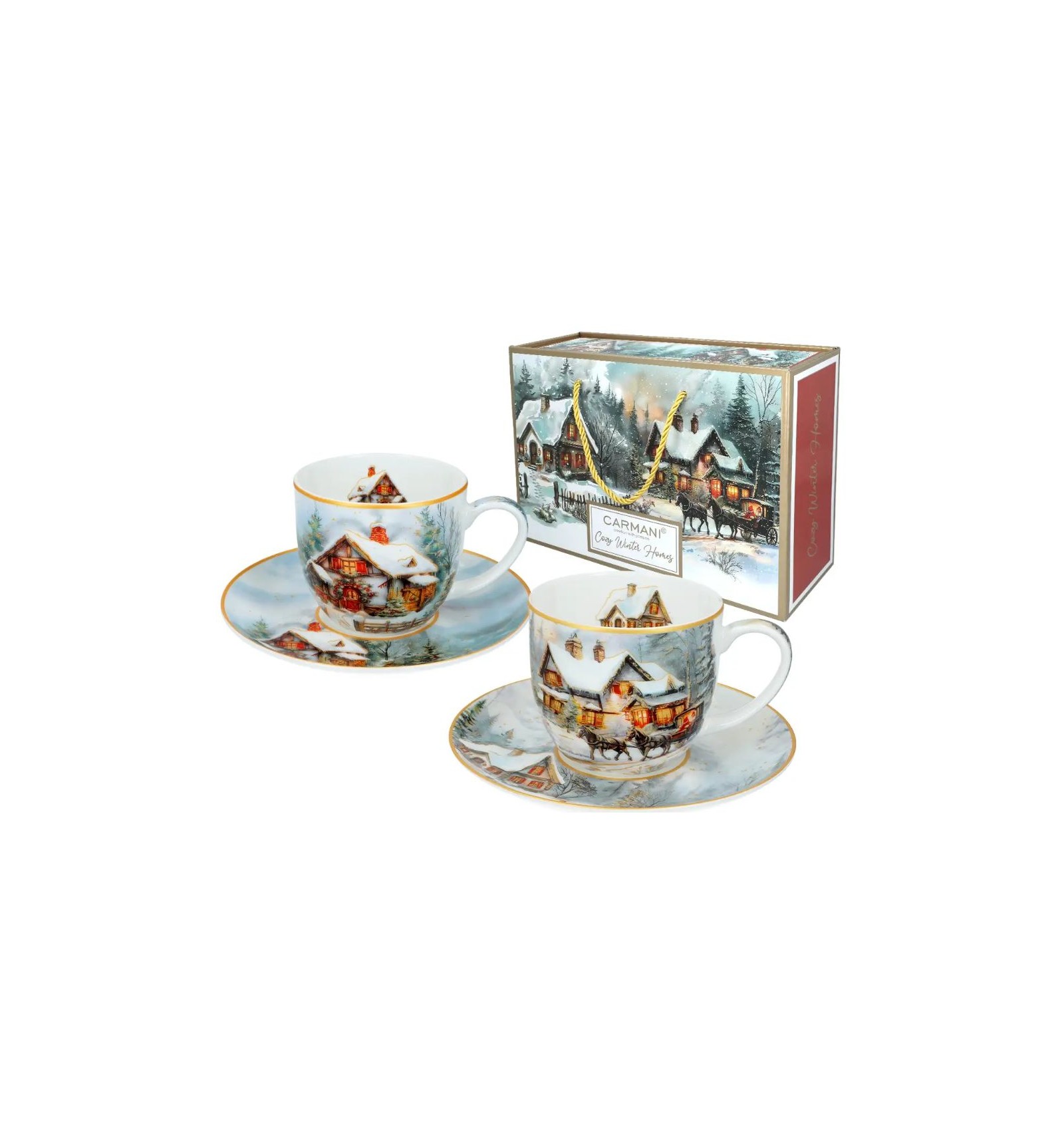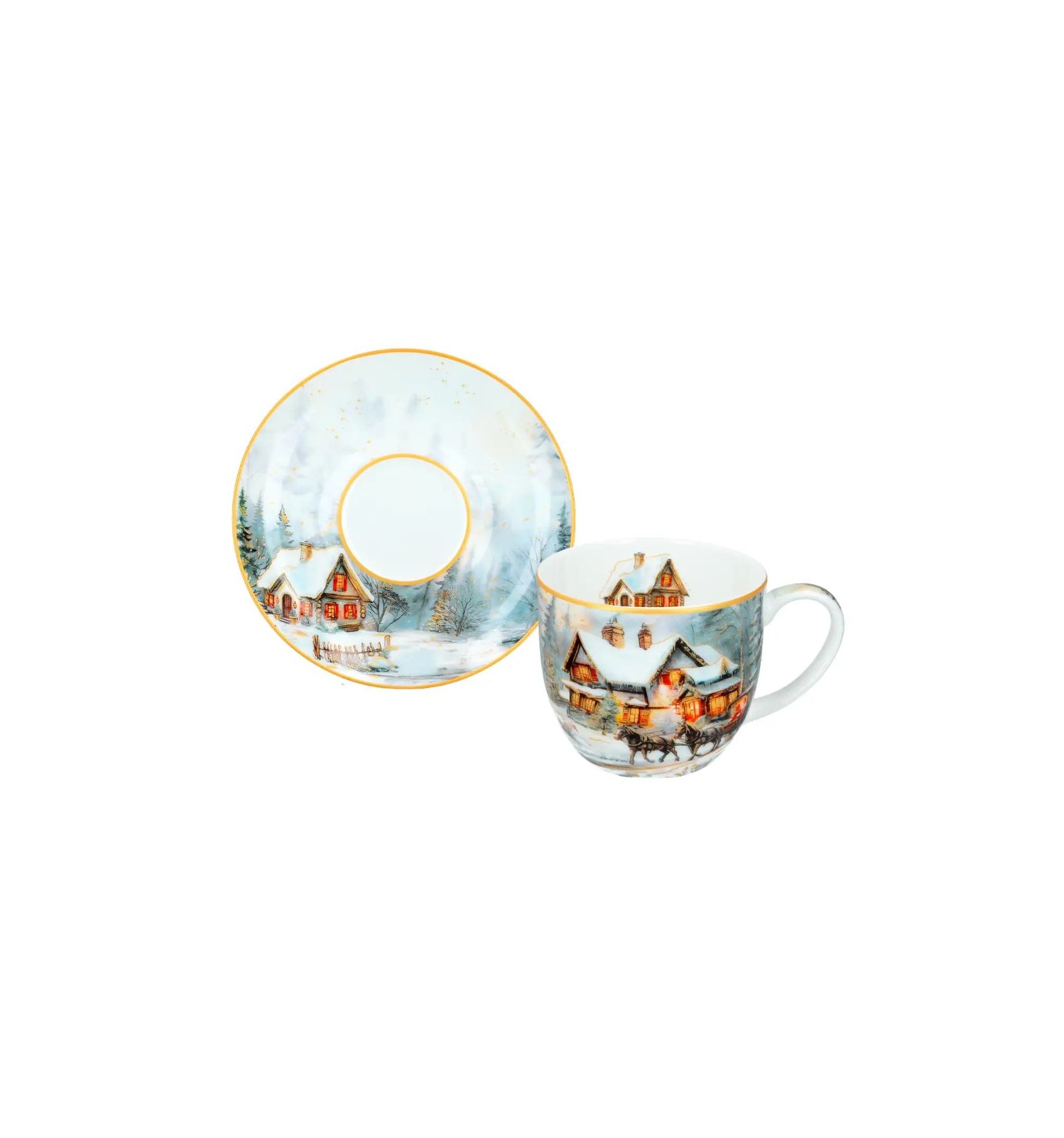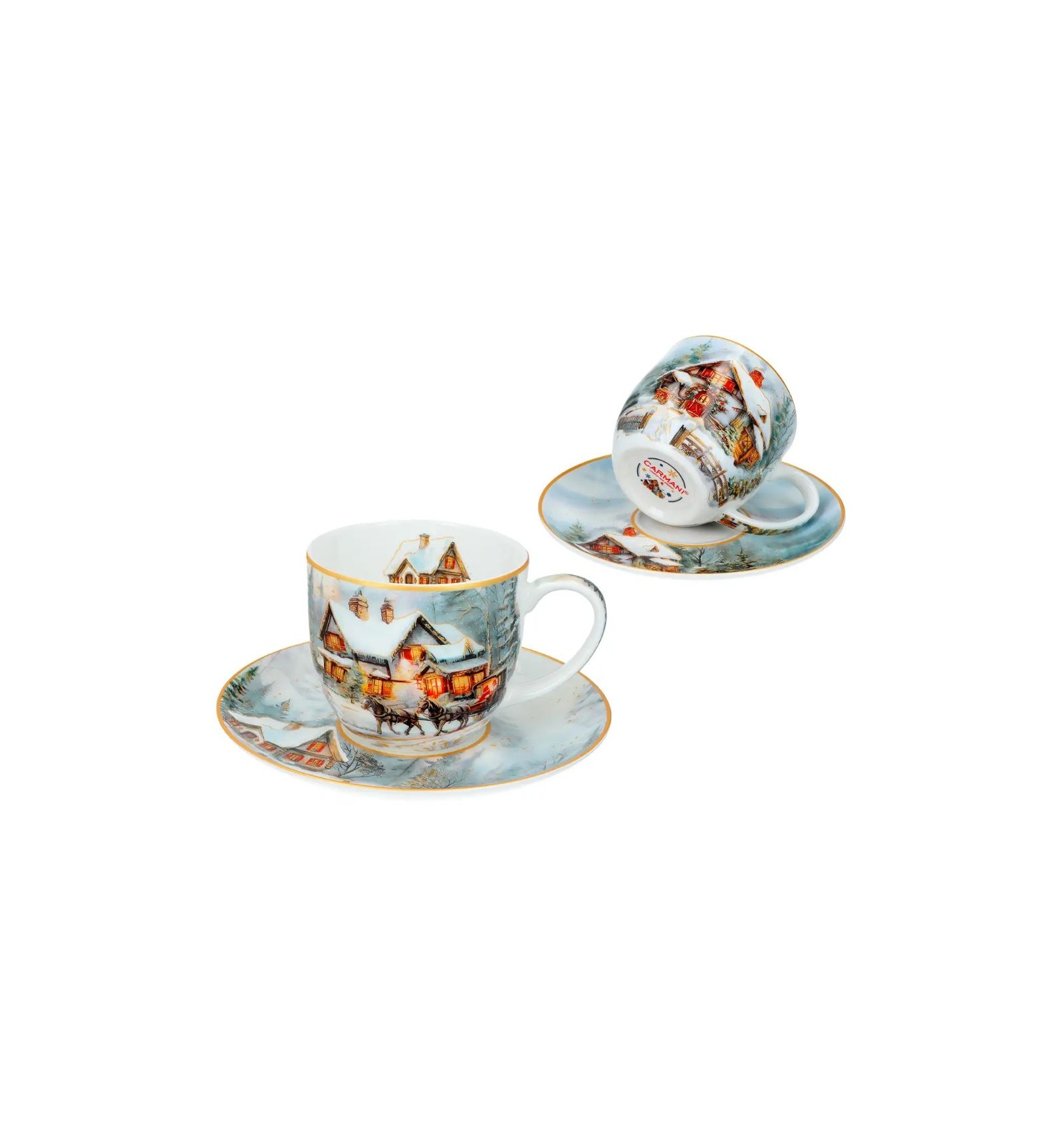Zestaw 2 szt filiżanek porcelanowych wraz z podstawkami wykonanych z porcelany bone china, przedstawiających urokliwą, zimową scenerię, podkreślającą świąteczny klimat.