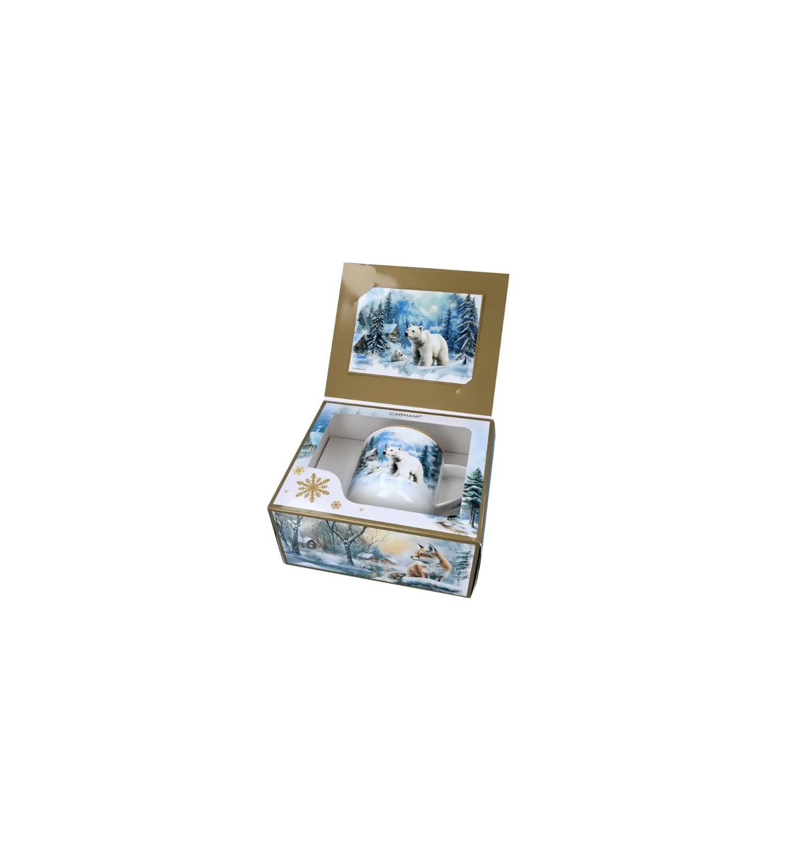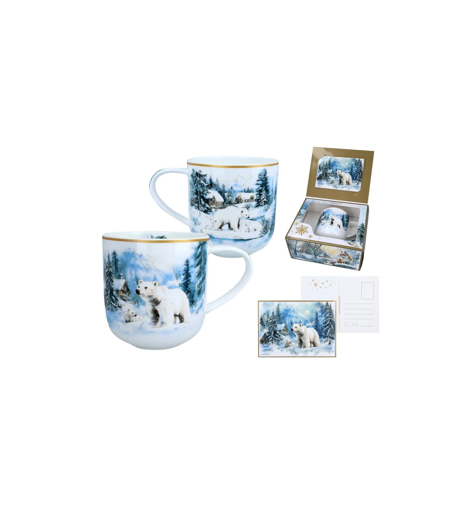 Duży, lekki kubek wykonany z porcelany bone china z urokliwym, zimowym krajobrazem z dostojnym niedźwiedziem polarnym. Zalety kubka: