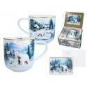 Duży, lekki kubek wykonany z porcelany bone china z urokliwym, zimowym krajobrazem. Kubek zapakowany jest w ozdobny kartonik. Naczynie przystosowane jest do mycia w zmywarce i używania w mikrofali.